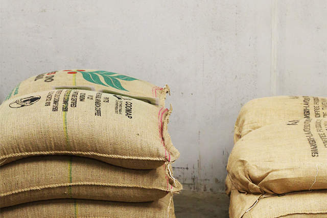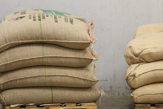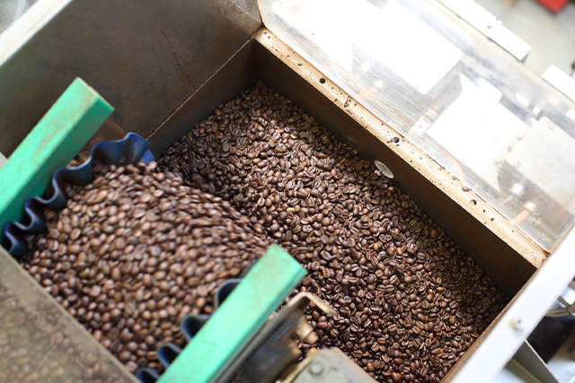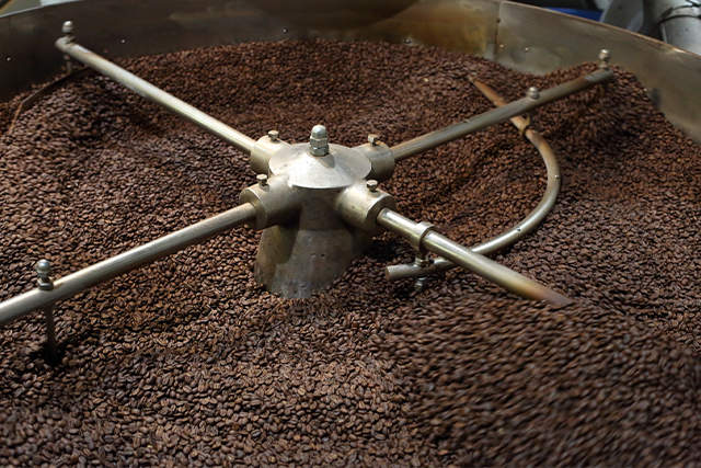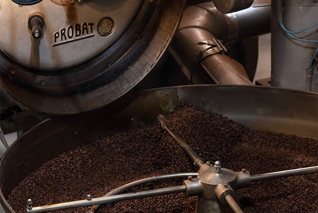 MB: "Wir rösten im Langzeittrommelröstverfahren – das bedeutet eine Röstdauer von 15-20 Minuten. Der Rohkaffee kommt in die Trommel, die durch Gas erhitzt wird und rotiert, damit die Bohnen in Bewegung bleiben und gleichmäßig geröstet werden. Dann passieren viele unsichtbare chemische Reaktionen. Was man von außen erkennen kann, ist die Größe – die Bohne wird größer und glatter. Die Farbe – sie wird dunkler. Und es riecht bisschen wie beim Toasten."