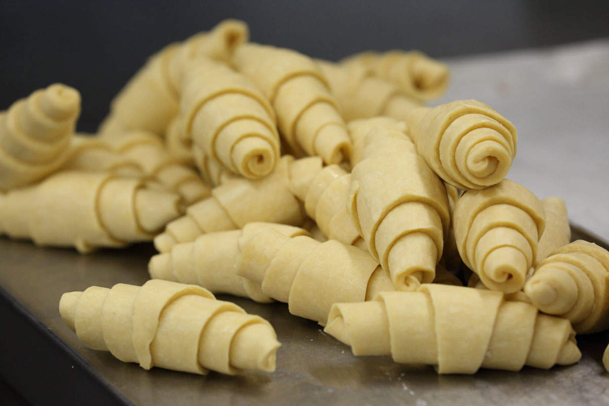 GC: "Das meiste sind unsere Kuchen, nach den Rezepten von Isolde Richter. Dann haben wir Torten, Croissants und Brioche für die Theke, Gebäck und Kekse für den Laden. Alles Süßes, das hier verkauft wird, kommt von uns. Das Rezept für die Brioche stammt aus der Konditorei aus meinem Dorf in Italien – die habe ich immer als Kind gegessen und es sind einfach die besten. Die kann ich auch zum täglichen Cappuccino sehr empfehlen."
