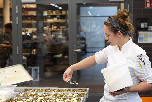 So beginnt in der DINZLER Konditorei jedes einzelne Backkunstwerk – ganz wie Zuhause. Die hauseigene Konditorei versorgt die DINZLER Genusswelt mit allen Gebäckstücken, Kuchen und Torten und natürlich dem Eis. Das Besondere: Hier wird noch nach echter, traditioneller Backkunst gearbeitet. Die Konditorei verzichtet komplett auf Zusatzstoffe und arbeitet ohne Fertigprodukte, wie beispielsweise Backmischungen. Dafür steht das Backteam früh auf und arbeitet mit höchster Sorgfalt. Frische, köstliche Produkte entstehen aus den regionalen und saisonalen Zutaten, die hier bevorzugt verarbeitet werden. Von der Teigherstellung, über den Backprozess bis zur Verpackung wird hier Hand angelegt – natürlich in Kombination mit moderner Technik.