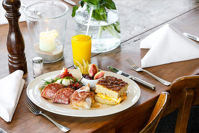Rohmilchkäse vom Obermooser und Schönegger, saisonale Früchte, Parmaschinken, Kaki, Brimi Fior di Latte Mozzarella, halb getrocknete Kirschtomaten, Basilikumöl, gebeizter Lachs mit Honig-Senf Sauce, eingelegte Gurke, Milano Salami, Oliven, Paprika Hummus, Frischkäseaufstrich, Butter, zwei weiche Bio-Eier, Marmelade, Pain Perdu mit Vanille-Orangen Creme und Blaubeerkompott.