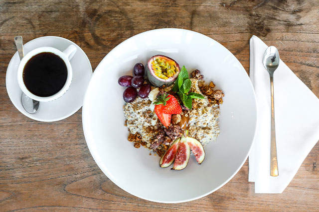 Mehrkorn-Müsli, Joghurt, saisonale Früchte, DINZLER Granola, Honig