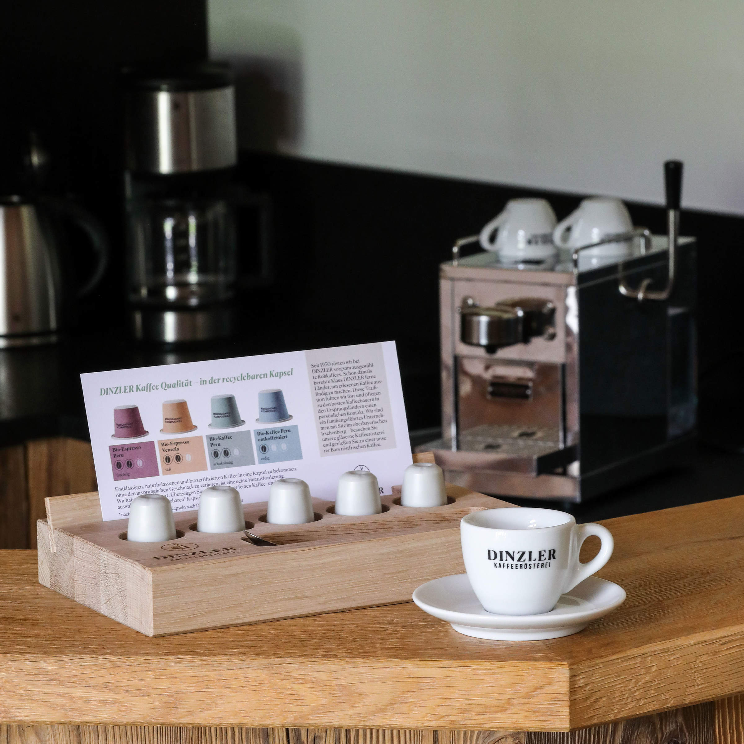 Bei der Zubereitung von Heißgetränken auf den Zimmern hängt das Ergebnis von den Gästen ab. Für Genussmomente mit “Gelinggarantie” lohnen sich hier Produkte, die besonders einfach in der Zubereitung sind und ein optimales, köstliches Geschmackserlebnis auf Knopfdruck bereitstellen können. Eine Kapselmaschine bietet die optimalen Voraussetzungen, da sie einfach zu bedienen ist und mit den DINZLER Bio Kaffeekapseln sehr gute Kaffeeergebnisse liefert. Ein großer Nachteil vieler gängiger Kaffeekapseln ist jedoch die nicht recycelbare und aluminiumhaltige Kapsel. Für uns bei DINZLER war das erklärte Ziel, eine zu 100 % recycelbare Kaffeekapsel anzubieten. Im Laufe der Entwicklung der DINZLER Bio-Kaffeekapsel haben wir uns für eine innovative, industriell kompostierbare Kapsel aus biobasierten Rohstoffen, wie Mais und Zuckerrohr entschieden. Befüllt werden die Kapseln mit bestem Bio-Kaffee, klimaneutral geröstet in der DINZLER Kaffeerösterei am Irschenberg.