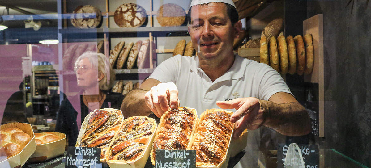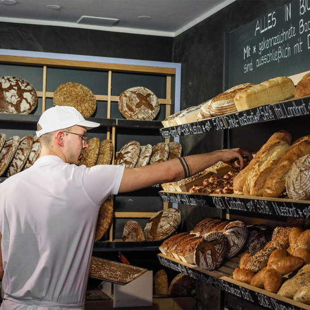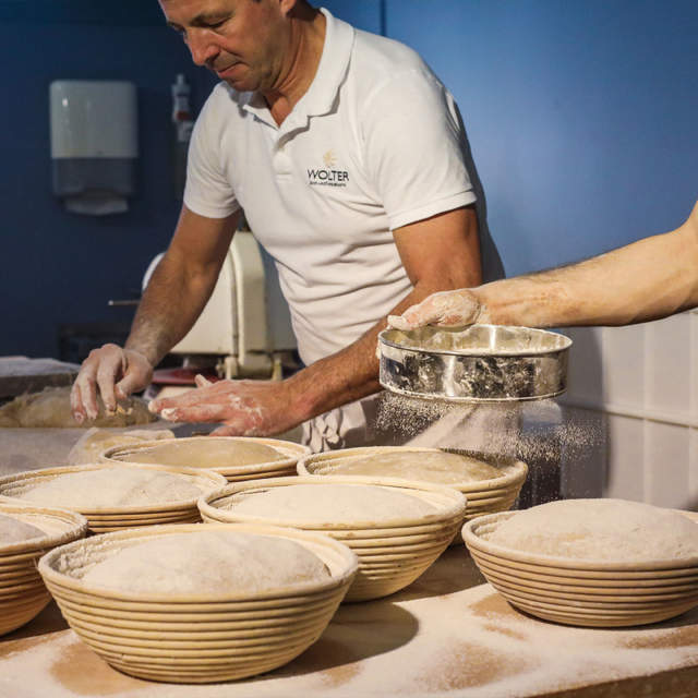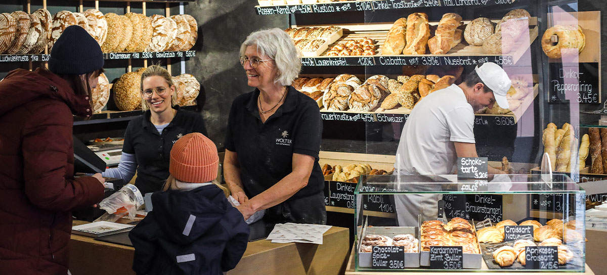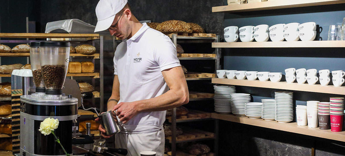 Ein Besuch in der Bäckerei Wolter ist ein wahres Erlebnis. Inmitten des Gastraums befindet sich die offene Backstube. Hier kann man den Wolter Bäckern dabei zusehen, wie sie Brot herstellen, Semmeln portionieren sowie Brezn und Croissants formen – alles transparent und in echter Handarbeit. “Wir haben nichts zu verbergen. Wer zu uns in die Bäckerei kommt, besucht uns quasi mitten in der Backstube und kann sehen, wie wir seine Frühstückssemmel backen”, erzählt Mathias Wolter. Für eine Bäckerei braucht es natürlich auch den passenden Kaffee – denn was gibt es Besseres als ein frisch gebackenes Croissant mit einem leckeren Cappuccino?