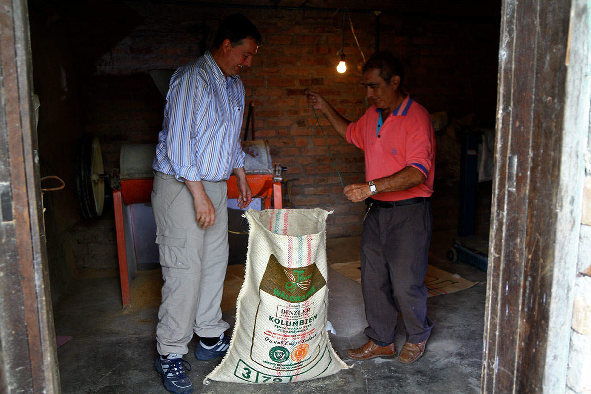Das feuchtwarme Klima in dieser Gegend Kolumbiens eignet sich hervorragend für den Anbau von Kaffeepflanzen. Nicht zu warm, nicht zu kalt, nicht zu trocken, nicht zu feucht – die Kaffeepflanze zählt zu den anspruchsvolleren Pflanzen und braucht besonders viel Wissen und Betreuung, um Kaffeekirschen in optimaler Qualität zu ernten. Die Plantagen von Carlos beeindrucken durch ihre verwachsene, fast schon “wilde” Struktur. Seine Mischkultur entsteht durch die Kombination aus den Kaffeestauden mit Schattenbäumen. Dafür pflanzt der Landwirt unter anderem die Spezies Guamo oder Arrayán, sowie Kochbananenstauden oder Zitrusbäume, wie Orange, Mandarine, Limone. Teilweise hat man das Gefühl, man steht mitten im Wald und nicht auf einer kultivierten Plantage, doch gerade diese Art des Kaffeeanbaus ist ein Garant für Artenvielfalt und Diversität. Da die Hänge direkt im Biosphärenreservat liegen, sind die Möglichkeiten der Bewirtschaftung stark reguliert. Carlos muss daher seine Plantagen besonders naturnah bewirtschaften – immer im Einklang mit der Natur. Der Anbau und die Ernte werden in kompletter Handarbeit geleistet – etwas anderes ist in den verwachsenen Hängen gar nicht möglich. Zudem dürfen aufgrund der Regularien im Reservat keine Pestizide verwendet werden. Bei konventionell angebautem Kaffee bleiben Rückstände der verwendeten Pestizide im Kaffee und beeinflussen auch nach der Röstung den Geschmack. Zudem wirken sich aggressive Spritz- und Insektenvernichtungsmittel negativ auf die Artenvielfalt aus und zerstören so langfristig die Natur. Das naturnahe Konzept und die Arbeitsweise auf Carlos Finca entspricht genau den Ansprüchen der DINZLER Kaffeerösterei: ein nachhaltiger Kaffee aus Kolumbien in absoluter Premium-Qualität! Bei DINZLER am Irschenberg rösten die Röstmeister aus Carlos Rohkaffee den DINZLER Kaffee Columbia Buenavista.