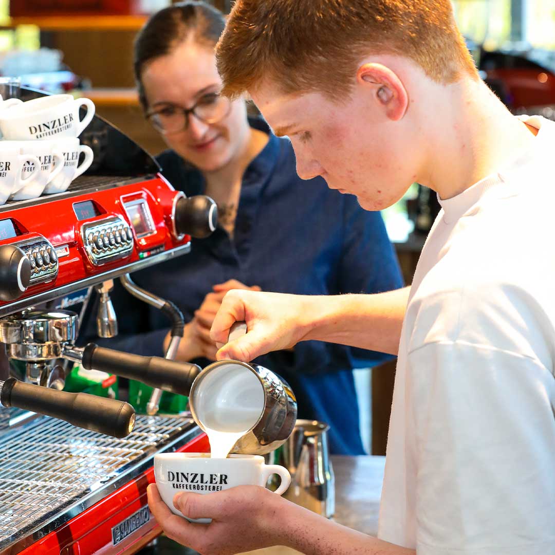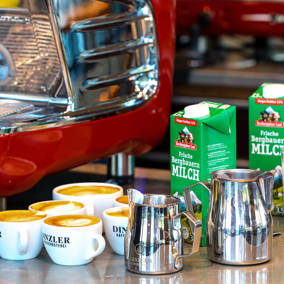 Cappuccino und Latte Macchiato sind wohl die beliebtesten Kaffeegetränke in ganz Deutschland. Im Lieblingscafé, ToGo oder zuhause: Die perfekte Krone aus Milchschaum, die den Getränken ihre angenehme Süße und Cremigkeit verleiht, gelingt nur mit der richtigen, hochwertigen Milch. In der DINZLER Kaffeerösterei setzen wir dabei seit über zehn Jahren auf die Milch von der Molkerei Berchtesgadener Land: Hohe Milchqualität, der richtige Eiweißgehalt und eine schonende Verarbeitung legen den Grundstein für perfekten Milchschaum. Durch die regionale Nähe zu Berchtesgaden und die fair bepreiste Arbeit der Landwirte erfüllt sie zudem die hohen Qualitätsstandards an unserer Kaffeebar – ideal für eine köstliche Tasse Cappuccino oder einen cremigen Latte Macchiato.