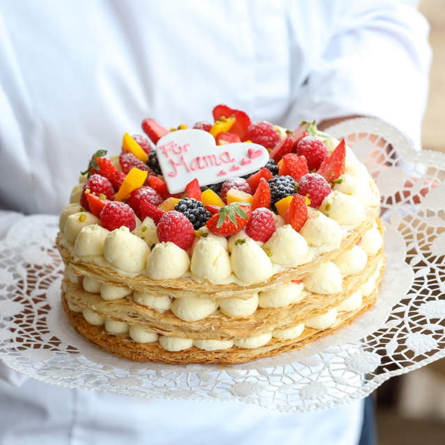 Den Blätterteig ausrollen und in gleich große Stücke schneiden. Die Form können Sie dabei selbst bestimmen, wichtig ist, dass die Teigplatten für die Tortenschichten gleich groß sind.