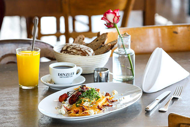 Das DINZLERmoment Frühstück bringt Menschen an unseren großen Holztischen zusammen. Angerichtet in der Mitte des Tisches und serviert in 2 Gängen zum gemeinsamen Essen und Teilen.