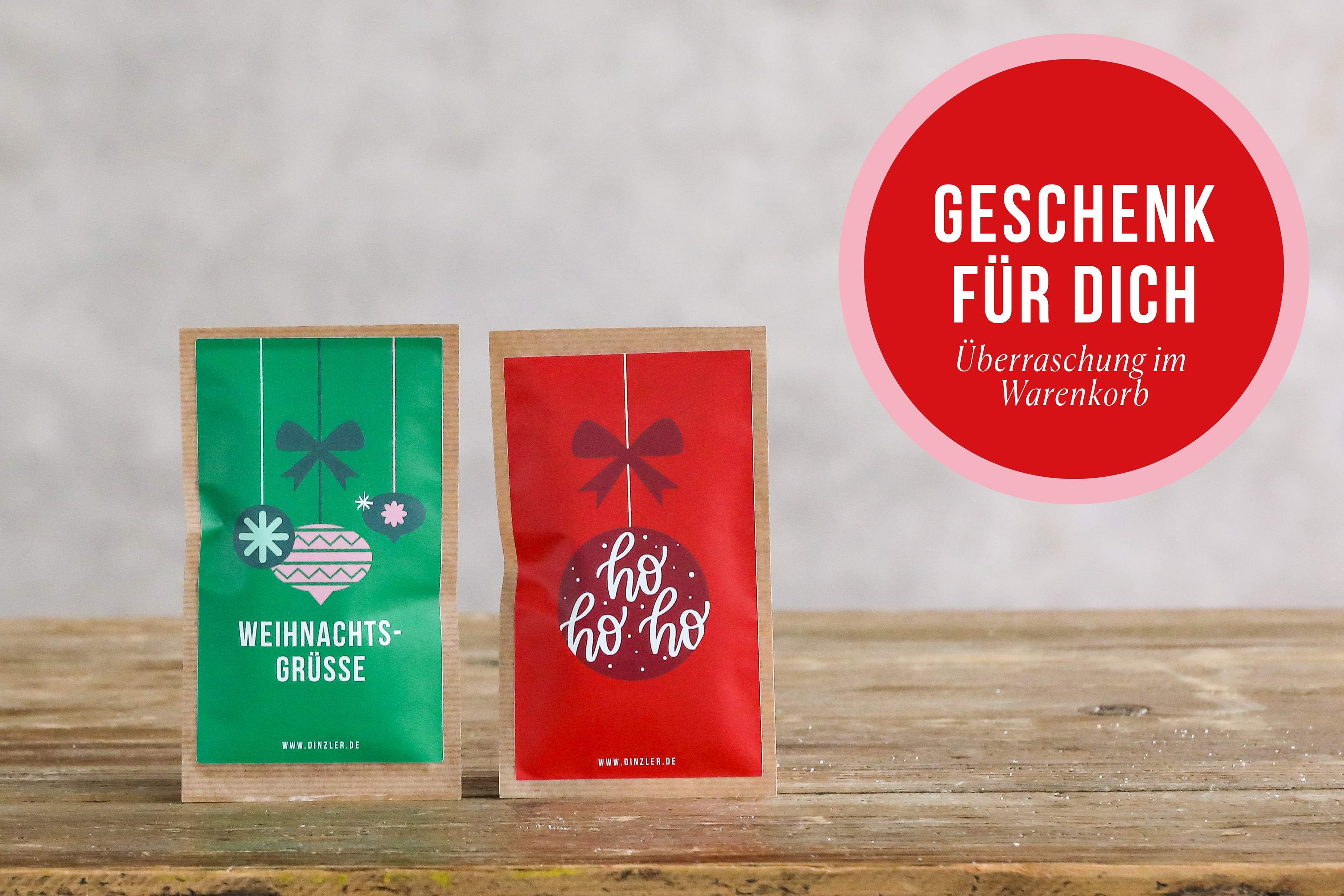 Sie erhalten heute ab einem Einkauf von 50€ im DINZLER Online-Shop oder im Bohnenladen am Irschenberg automatisch zwei DINZLER Kaffeebeutel mit Weihnachtsmotiv*. Die Aktion ist nur am 6.12.2025 von 0:00 bis 23:59 Uhr gültig. Es ist keine Farbwahl möglich.