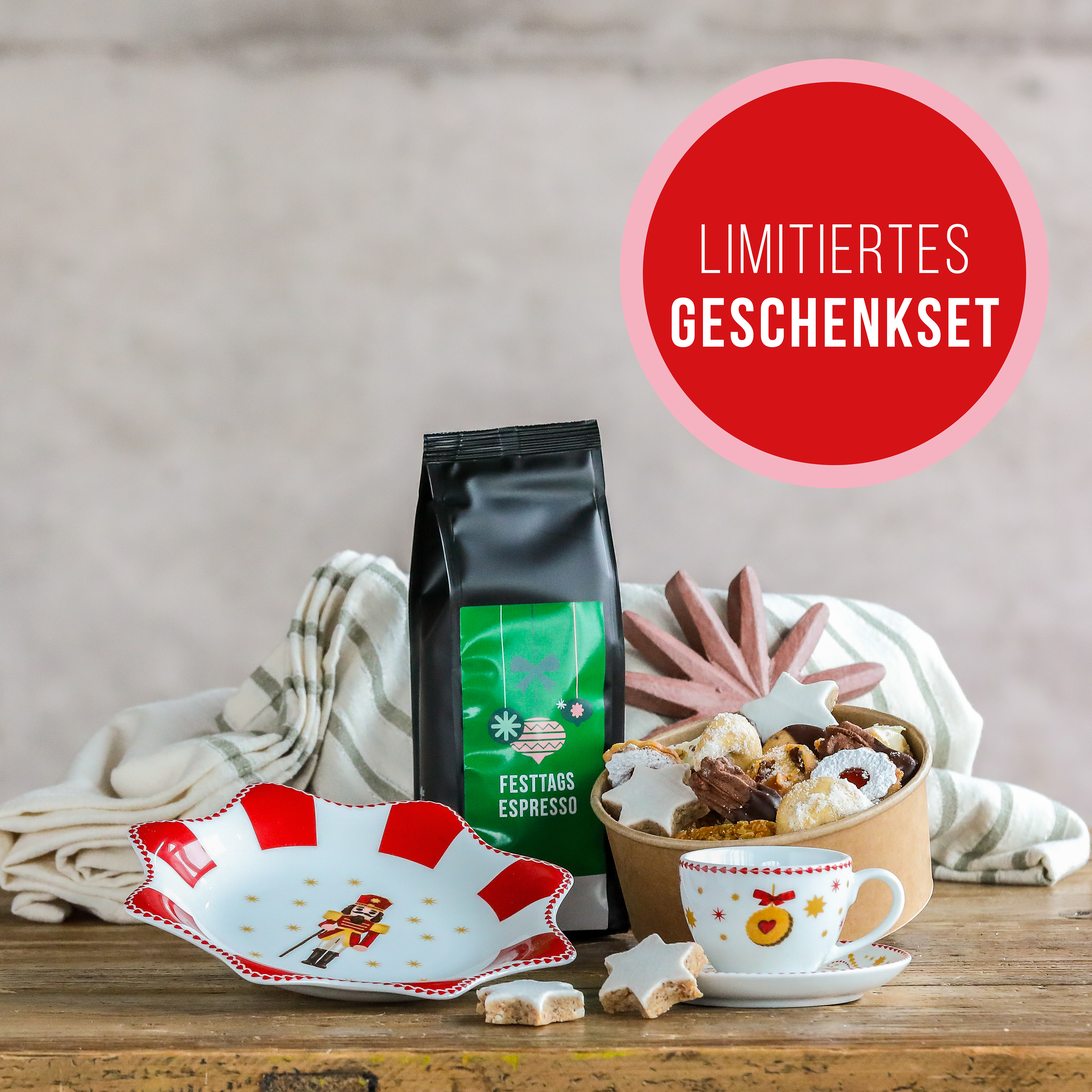 Das Set besteht aus einer eleganten Espressotasse mit passender Untertasse und einem kleinen Plätzchenteller von Hutschenreuther – perfekt für eine gemütliche Kaffeepause in der Adventszeit. Optimal ergänzt wird das Porzellan durch zwei saisonale Highlights aus dem Hause DINZLER: unseren aromatischen Festtagsespresso sowie die DINZLER Plätzchenmischung, die jedes Kaffeeritual perfekt abrundet.