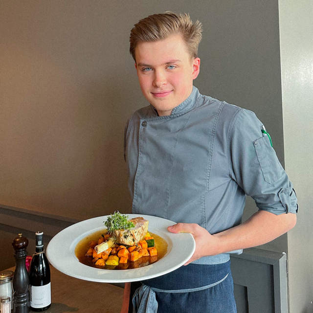 In der DINZLER Küche wird noch “echt” gekocht – mit frischen Zutaten und handwerklicher Zubereitung. Julius ist bereits im zweiten Lehrjahr als Koch und übernimmt verschiedene “Mise en Place”-Tätigkeiten, also die Vorbereitung verschiedener Gerichte, sowie das Anrichten der Frühstücke oder die Zubereitung von Eierspeisen. “Die Zusammenarbeit mit den Kollegen ist sehr nett und mir wird wahnsinnig viel gezeigt”, erzählt Julius begeistert. Besonders schätzt er, dass es bei DINZLER keinen Teildienst gibt und man durch die unterschiedlichen Schichten immer wieder wechselnde Arbeitszeiten hat. Somit bleibt genügend Zeit für Freunde, Familie und Hobbys – wie beispielsweise das Angeln oder Skifahren.